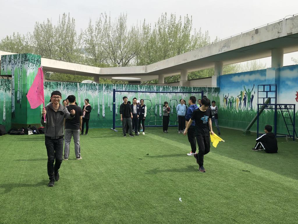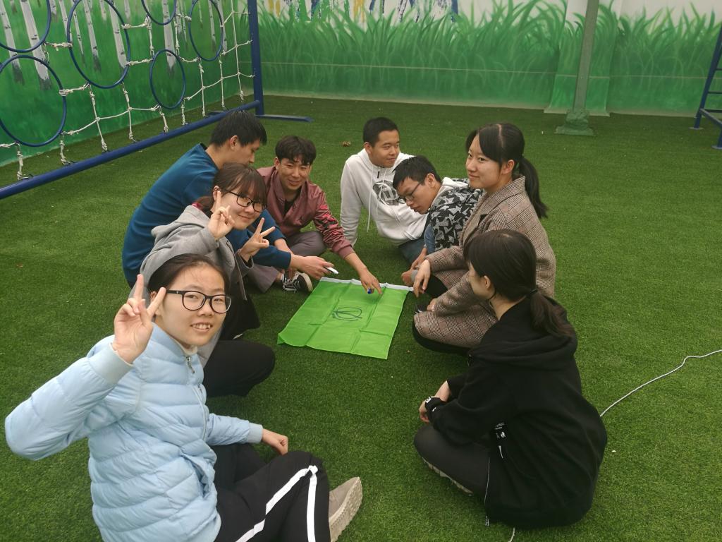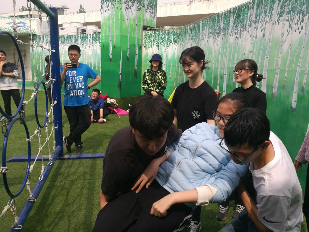 在位于知行北楼平台心理素质拓展基地,来自中法大一、大二、大三的不同班级的同学在经过简单的热身后被随机分为三队。队员们为自己的团队设计了队名、队旗与队歌。