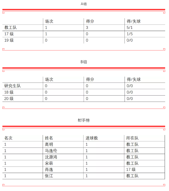 在此后的比赛中,教工队的射门多次考验了17级的门将,但门将的神勇表现没有让比分再次被扩大。17级组织的几次反击也没能对教工队的球门造成威胁。