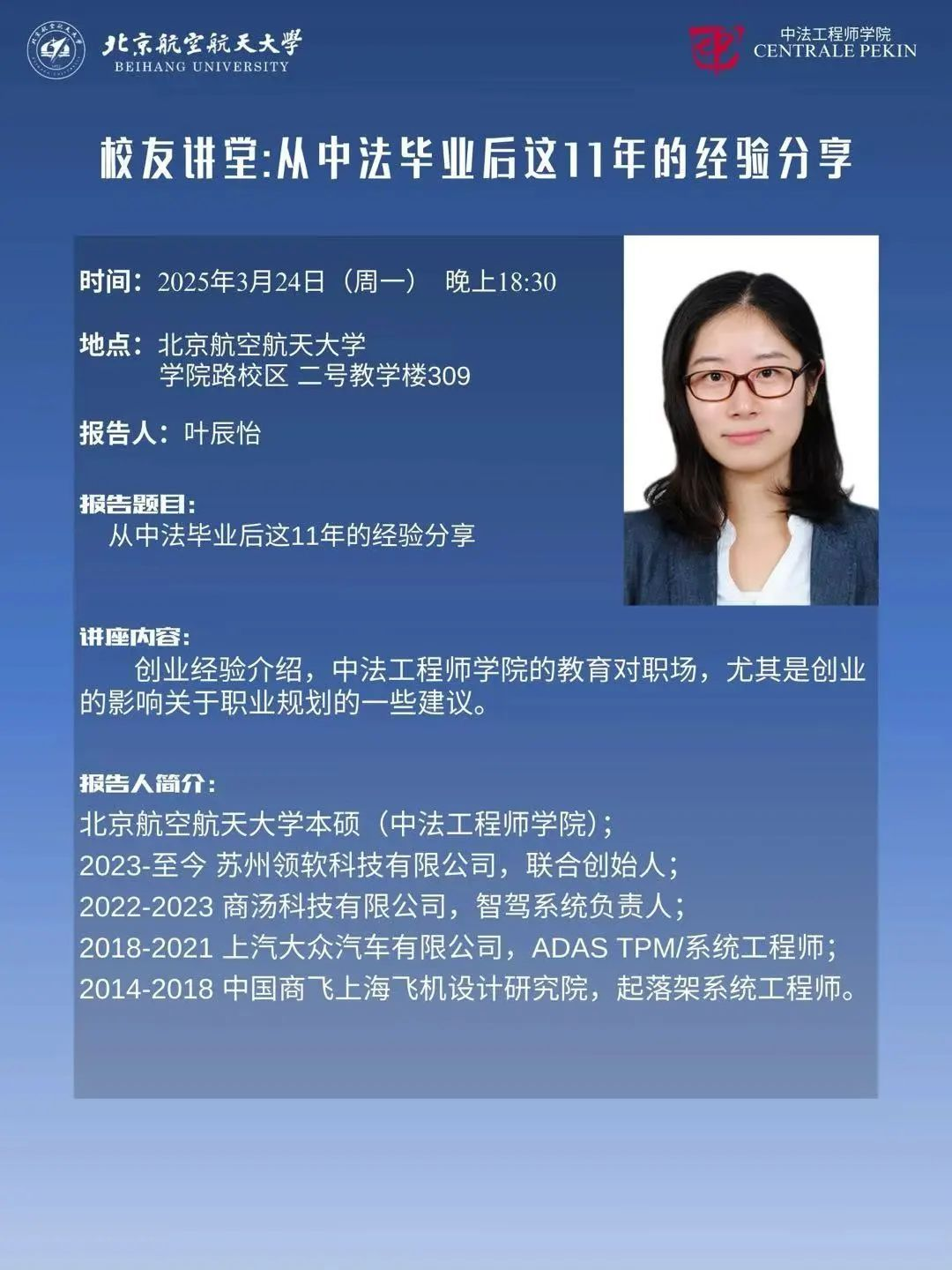 叶辰怡,北京航空航天大学本硕(william威廉中文官网)毕业生,现任苏州领软科技有限公司联合创始人(2023年至今),曾任商汤科技有限公司智驾系统负责人(2022-2023年)、上汽大众汽车有限公司ADAS TPM/系统工程师(2018-2021年)以及中国商飞上海飞机设计研究院起落架系统工程师(2014-2018年)。