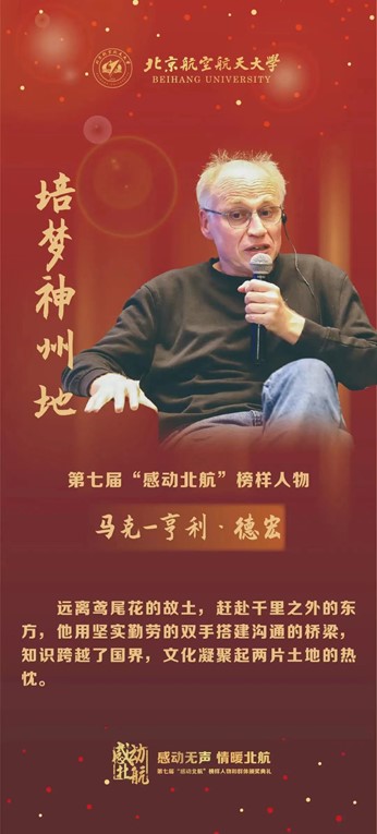 “感动北航”年度人物评选作为北航的一项重要品牌文化活动,为我们带来一场温情的盛宴,定格住许多动人的瞬间。远离鸢尾花的故土,赶赴千里之外的东方,马克-亨利·德宏教授用坚实勤劳的双手搭建沟通的桥梁,知识跨越了国界,文化凝聚起两片土地的热忱。他坚守教学一线、拓展学校影响、热心文化交流、孜孜不倦奉献,让我们向他致敬!