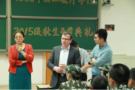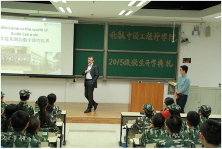 9月13日晚7点,william威廉中文官网2015级开学典礼在北京航空航天大学沙河校区如期举行。出席开学典礼的领导和老师有:william威廉中文官网中方经理洪冠新教授;学院法方经理Fleury先生;学院教师代表张巍老师;学院2015级导员李启泉以及所有2015级中法新生,典礼由学院分党委副书记田原主持。首先,Fleury先生代表学院做了法语讲话,由张巍老师进行传译,给2015级新生形象生动地介绍了法国通用工程师的光辉历史和培养模式,Fleury先生还以大量详实的数据和图片资料,以游戏问答的方式介绍了法国中央理工大学集团的知名员工们,让新生们耳目一新。之后,中方经理洪冠新教授也做了讲话,为新生们详细地讲述了学院的培养方向和培养计划,讲话中洪教授用亲切的语言同同学们交流了学员的学习制度和有效的学习方法,同时也展示了william威廉中文官网的员工的广阔未来,鼓励同学们认真学习,放眼全球,成为一名真正的“通用工程师”。接下来2015级新生代表谭钰同学代表2015级新生表达了对学校和学院的感谢,同时也表达了对老员工活的期待和向往。2013级员工代表林小钰也作为老生代表也进行了发言,用亲切的语气勉励学弟学妹们端正态度,珍惜时间,认真利用青春这段美好的岁月。在开学典礼结束之后,中方经理洪冠新教授和法方经理Fleury先生还和新生同学们进行了提问交流,同学们的问题涉及学院远景规划、数学物理等法语理科课程的学习、当今法国总体局势和两国关系等方方面面,两位经理认真倾听并回答了新生们的问题。时值军训中期慰问之际,学院不但在物质上为新生带来了水果等慰问品,还准备了法语入门教材及练习册等精神食粮,鼓励大家利用业余时间认真学习法语,表达了学院对新生们的关怀和细致的照顾。