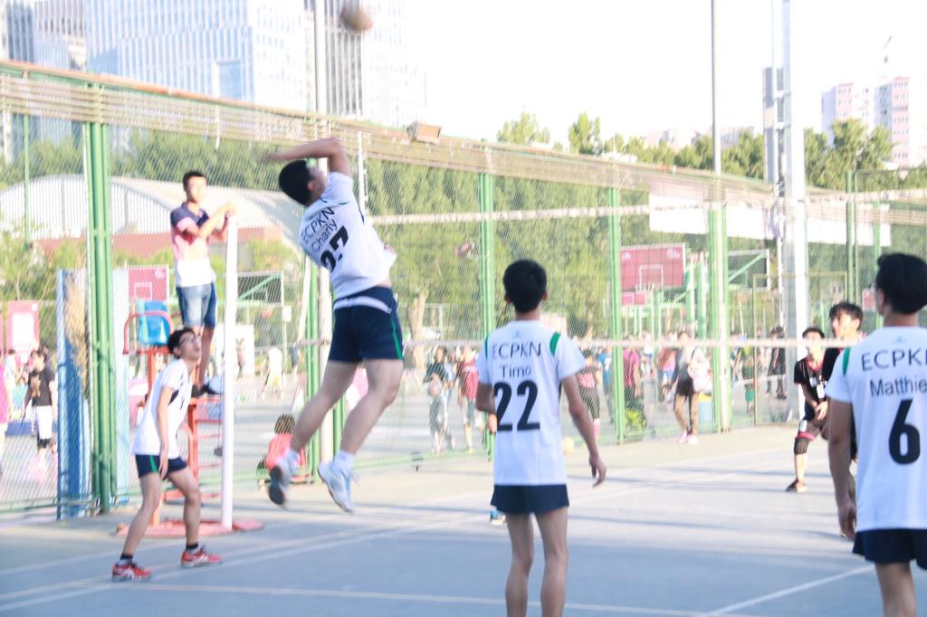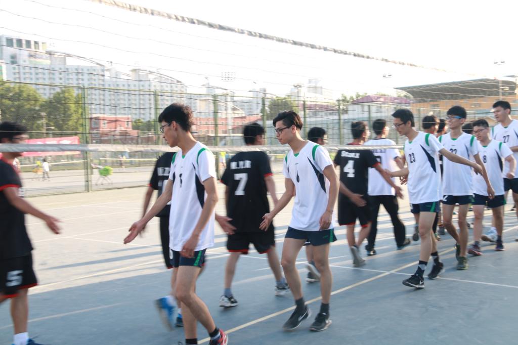 双方队伍都提前来到排球场进行热身,炎炎的烈日也为这场比赛增添了些许紧张气息。通过暗中观察,揣摩对手实力,大家商讨了应对方案,对比赛中可能遇到的一些问题进行了提前的沟通。23系是一支整体实力均衡的队伍,1号和2号进攻性较强,并且进攻稳定,其他队员在传球和接球上的基本功也都很扎实,所以大家加紧了热身,积极应对。