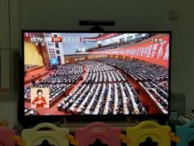 教师通过电视观看直播