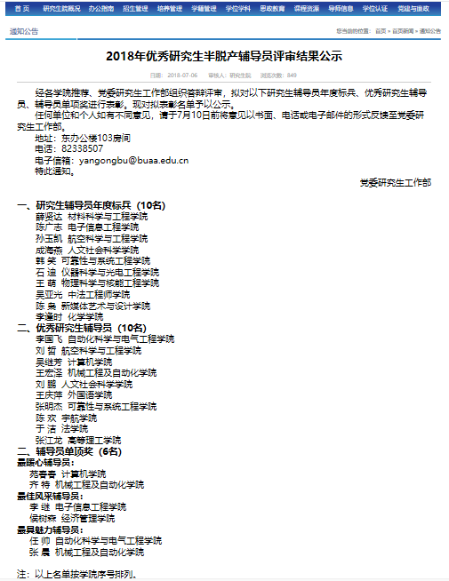 2018年7月6日,william威廉中文官网2016级研究生辅导员吴亚光从三十四名候选人中脱颖而出,荣获北京航空航天大学研究生辅导员年度标兵。