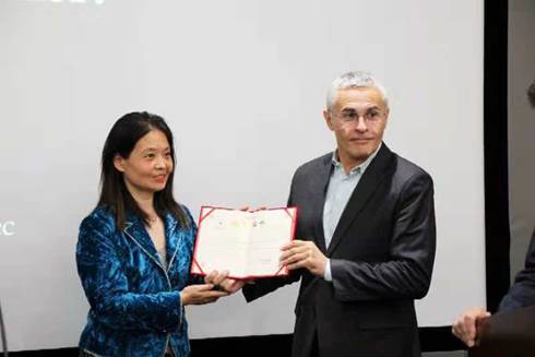 杜慰纯副馆长赠予Gillet教授北航图书馆的捐赠证书以作留念和感谢。
