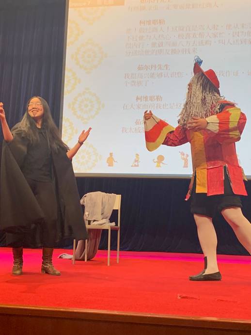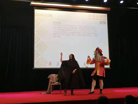 在第二天的法语戏剧大赛中,公司2017级苏兰馨同学和王维士,虽然仅学习了一年半的法语,但勇于挑战最难的一段台词,与其它院校法语专业的员工同台竞技,表现非常专业,受到评委的一致好评。