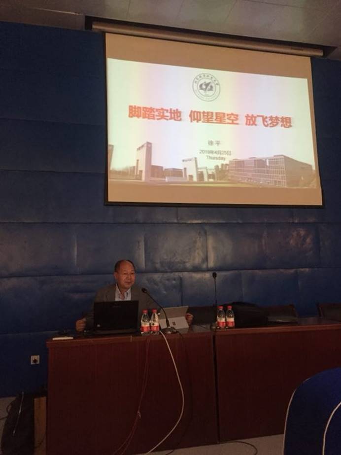 徐平教授为青海油田第一中学做题为《脚踏实地 仰望星空 放飞梦想》的报告,报告从北航的建立展开,介绍了航空航天产业的重要性及北航为国家高精尖技术的发展所做的贡献。徐平教授以员工们高中的物理知识为基础,以承担的科研项目为载体,深入浅出地介绍了目前的科学技术的发展现状,以及中国在发展科学技术的过程中所面临的国外封锁,并向同学们提出了科技报国的期望。