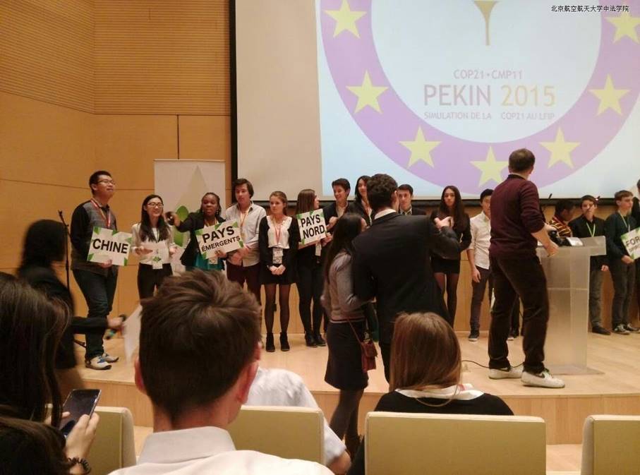 自11月中旬接到邀请以来,六位同学积极准备,进行了大量的材料搜集和文稿准备工作,期间多次和学院老师、法国国际学校老师交流;在会上,首先由丁硕良和张艺珺同学进行了3分钟的立场陈述,整个陈述用法语进行,言辞流利,观点清楚;在接下来的辩论环节,安琦、亓琪、王帆、柳君4位同学交替发言,用英法双语与其他各方代表热烈讨论、交流思想。