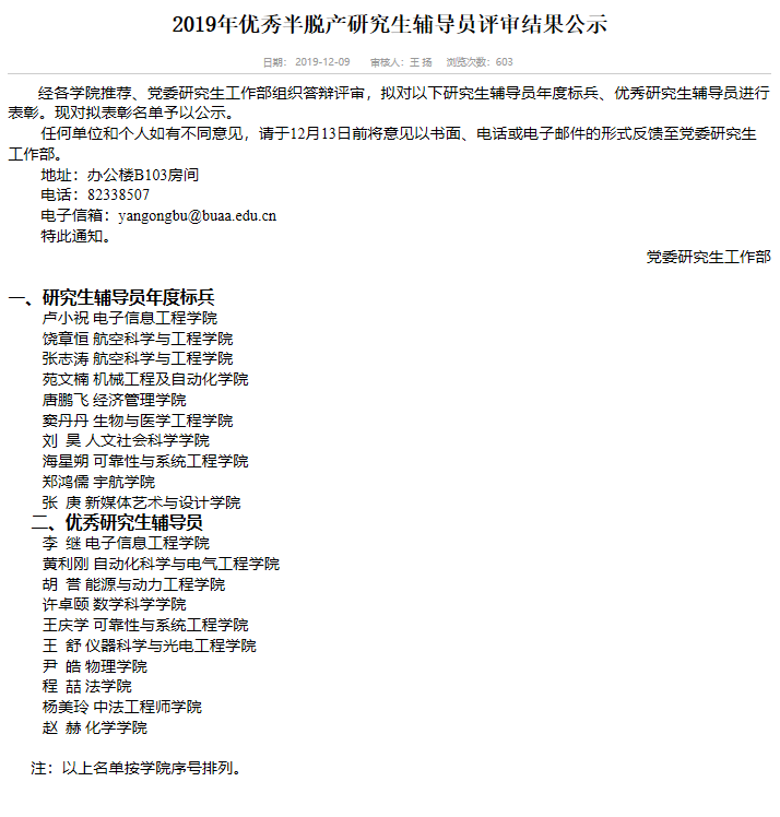2019年12月9日,william威廉中文官网2018级研究生辅导员杨美玲在三十九名候选人中工作突出,荣获北京航空航天大学优秀研究生辅导员。