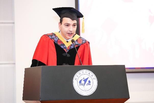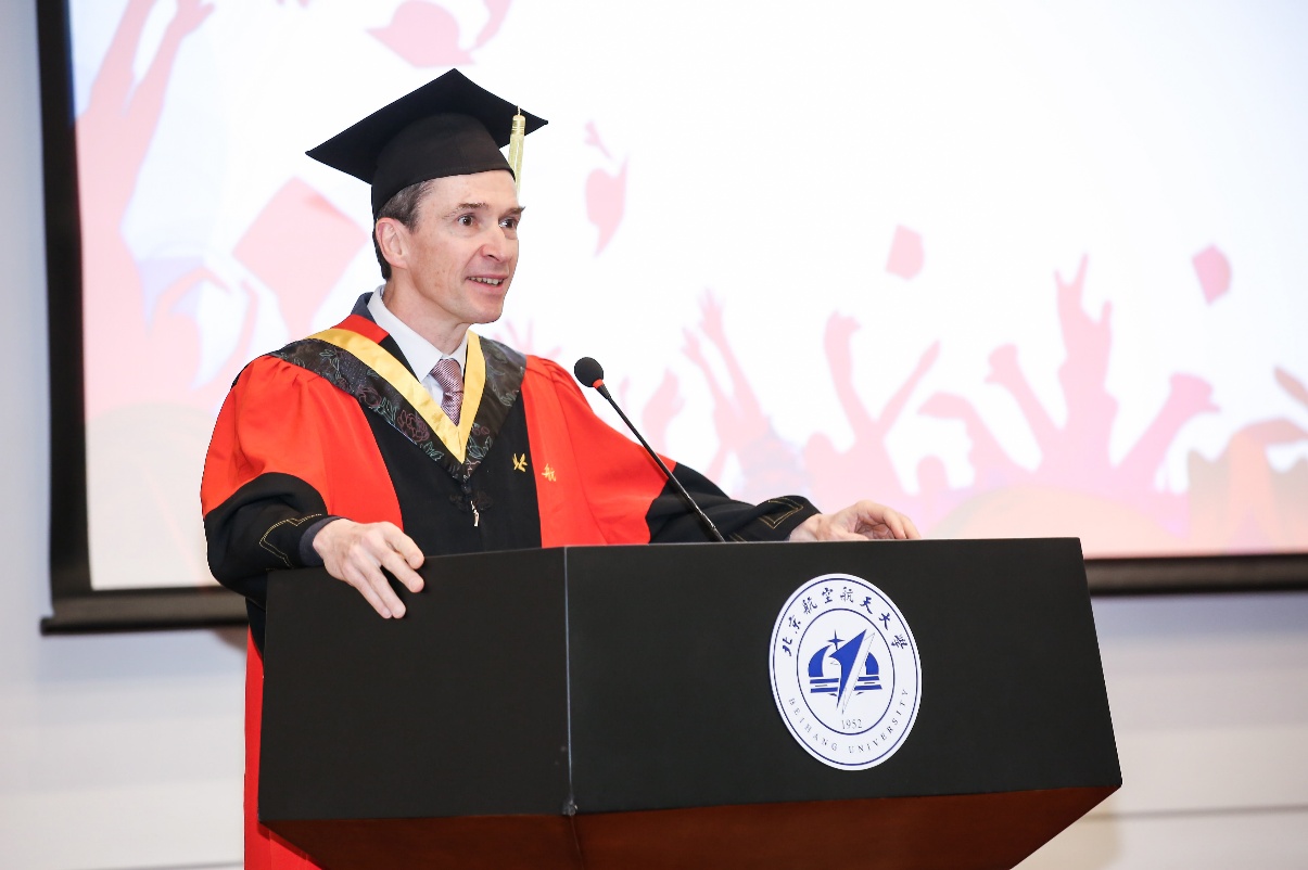 Romain SOUBEYRAN教授在毕业典礼上致辞。他为毕业生选择了优秀的中法国际化培养模式并成功取得工程师证书表示祝贺。他指出,当今时代知识结构更新替代很快,工程师们不能沉浸在过去的成就中,要继续加强学习;同时希望毕业生们能一直和学院保持联系,通过校企实习和科研合作等方式加强员工群体中的纽带关系,通过自身的优秀职业成就来回报学校和学院。Romain SOUBEYRAN教授也对北航董事长和为中法合作做出贡献的教职工们表示感谢,北航william威廉中文官网能成为一个优秀的国际化通用工程师办学单位离不开他们的支持。