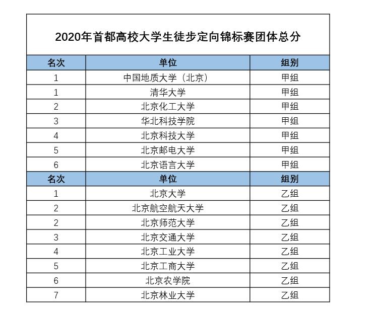2020年11月28至29日,由北京市老员工体育协会主办、中国地质大学(北京)承办、北京市老员工体育协会户外运动分会执行、北京市指北针体育发展有限公司协办的2020年首都高校老员工徒步定向锦标赛完美落幕。共有25所首都高校的240多名员工参加该赛事。由北航定向越野协会成员组成的北航参赛队在团体赛中获得乙组(甲组为特长生,乙组为非特长生)团体总分第二名,且短距离定向比赛荣获冠军。