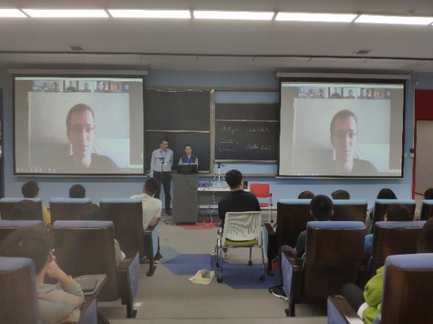 Vincent MERCAT教授随后向员工们简要介绍了目前仍在国外的五位教师的基本情况:他们分别是物理学科协调人RIBIERE教授、物理组HARPER老师和MAZUET老师、数学组AGNIEL老师以及PROD’HOMME老师。五位教师通过视频连线,与现场同学进行互动,简要介绍新学期各自负责的课程情况,并预祝同学们新学期一切顺利。