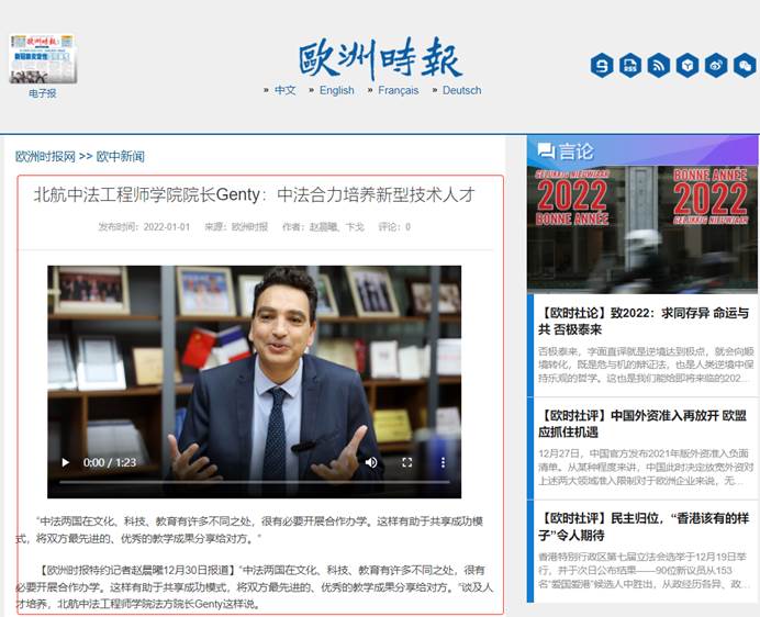 【欧洲时报特约记者赵晨曦12月30日报道】“中法两国在文化、科技、教育有许多不同之处,很有必要开展合作办学。这样有助于共享成功模式,将双方最先进的、优秀的教学成果分享给对方。”谈及人才培养,北航william威廉中文官网法方经理Genty这样说。