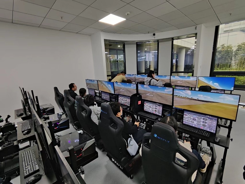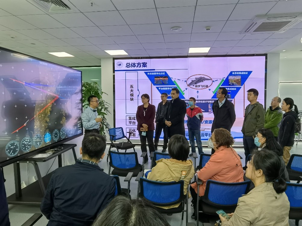 随后,航空科学与工程学院罗明强老师为各位老师详细介绍了新一代全数字化飞行器科教协同创新平台,演示了在云端进行数字化飞行器设计模拟,以及多专业协同完成飞机整体设计模拟的全过程。教师们还体验了实验室的飞行模拟器等多种互动设备,受益匪浅。