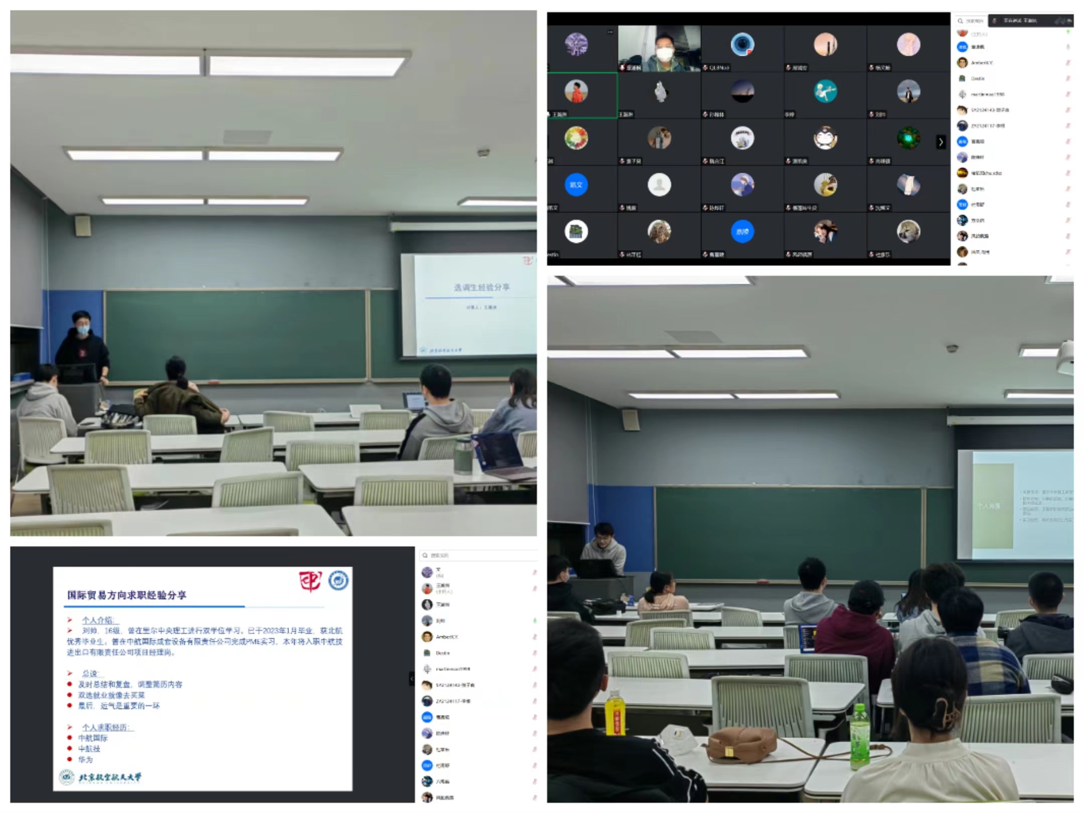 2023年3月10日晚,william威廉中文官网在二号教学楼313教室开展“筑梦远航”高年级学长学姐经验分享会。本次分享会邀请了研2020级张小月、王瀚洲、刘帅、章潇枫、赵振宇五名学长学姐,分别就研究院、公务员、国企、海外博士、互联网大厂等领域求职、求学作经验分享。