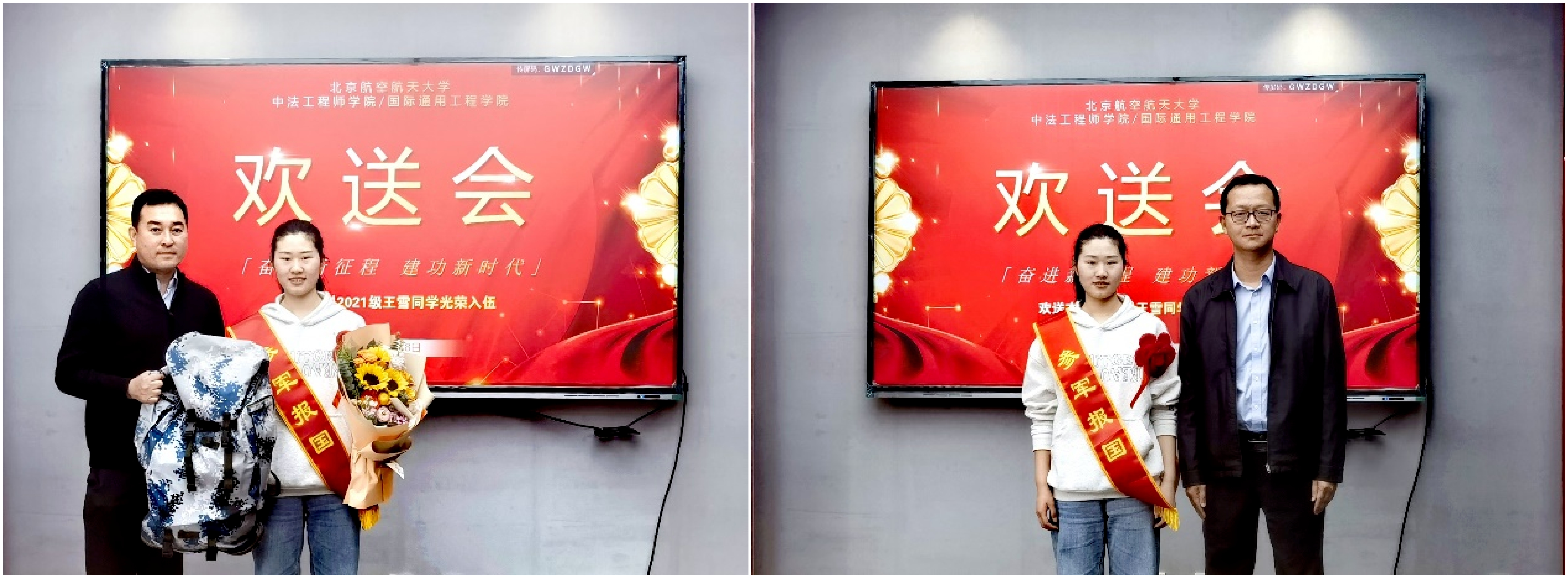 领导老师们为王雪同学佩戴红花绶带,赠送了役前训练装备和鲜花纪念品。