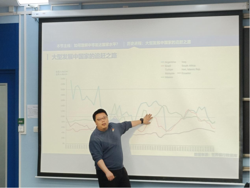 其次,孙老师围绕“全面建设社会主义现代化国家”这一重要论题,从党的二十大报告中提出的“到2035年,人均国内生产总值迈上新的大台阶,达到中等发达国家水平”这一表述出发,由浅入深,进一步阐述中国面临的挑战,让同学们对于全面建设社会主义现代化国家有了更深层次的理解。