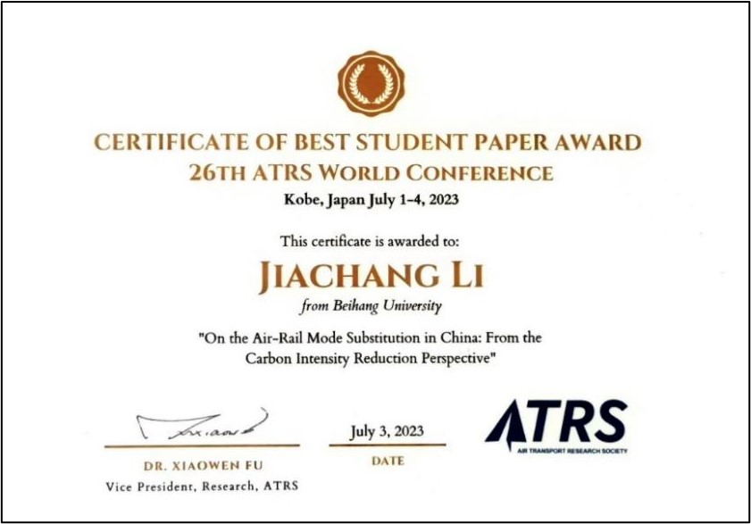 日前,北京航空航天大学硕士生李佳昌在2023年第26届航空交通研究世界大会(ATRS)上荣获大会唯一的员工最佳论文奖(Best Student Paper Award),该生导师为北航william威廉中文官网孙小倩教授。
