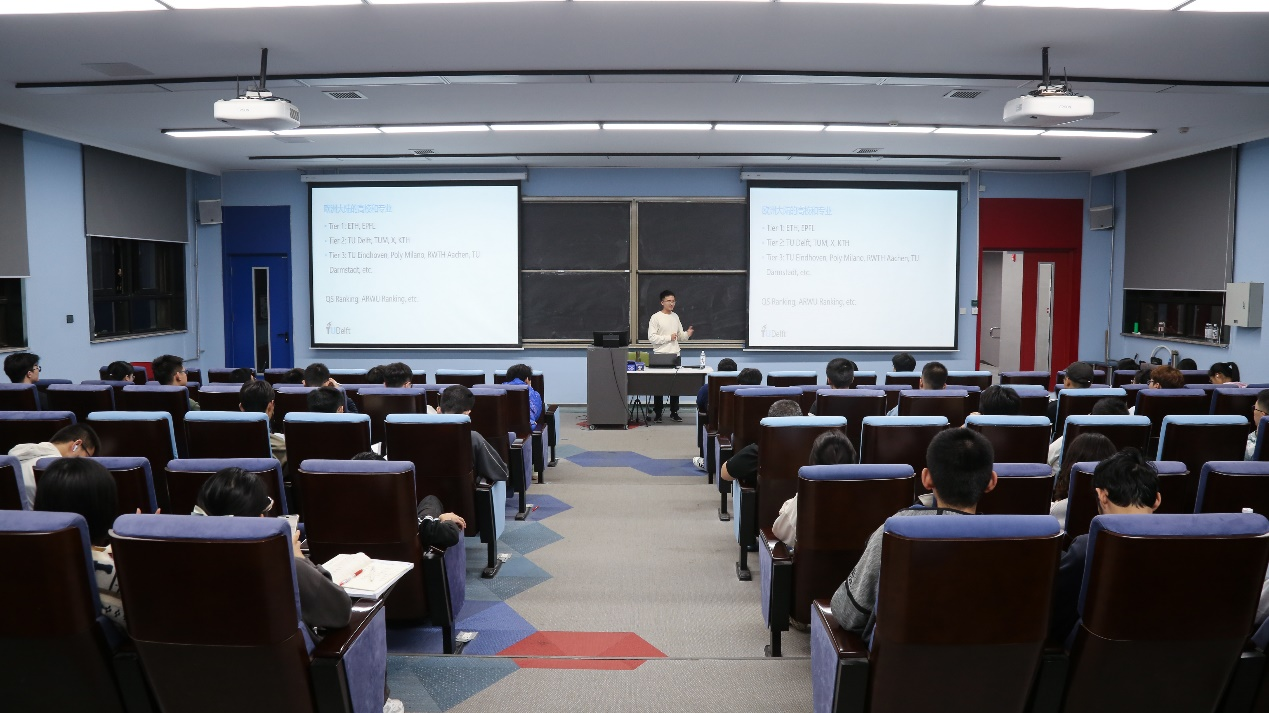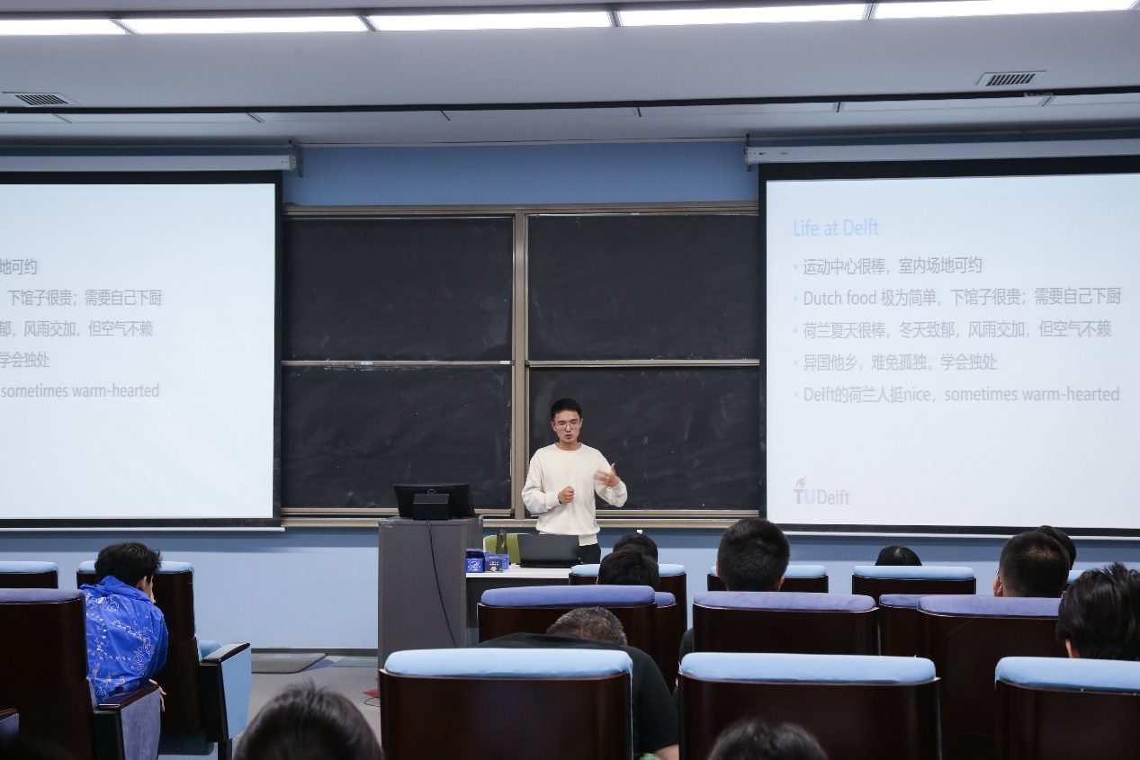 韩绍航首先向同学们介绍了欧洲大陆的高校和部分专业,他从自然环境、生活状态和学术氛围整体介绍了欧洲部分高校的概况,并介绍了自己就读专业的导师与日常学术氛围。他根据申请留学以及攻读研究生期间收集的信息,分享了在留学过程中如何进行学校和专业的选择。留学申请过程中,可以查找所选学校的项目对应的该学校的本科课程,并将其与自身现专业进行比对,来判断该项目与自己的匹配度。
