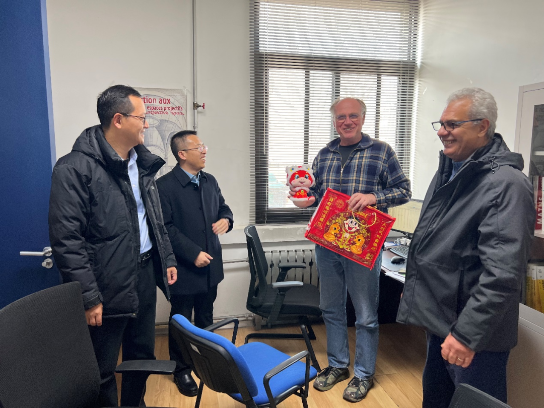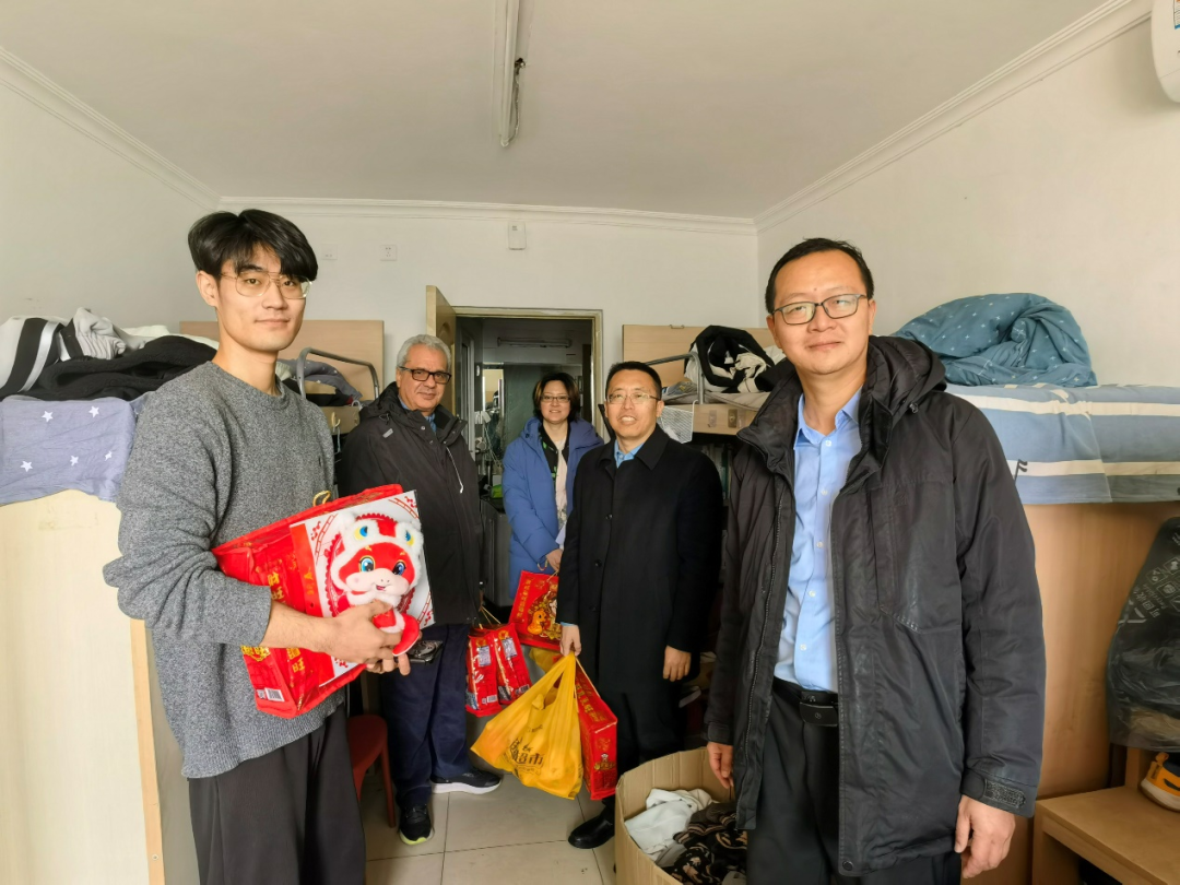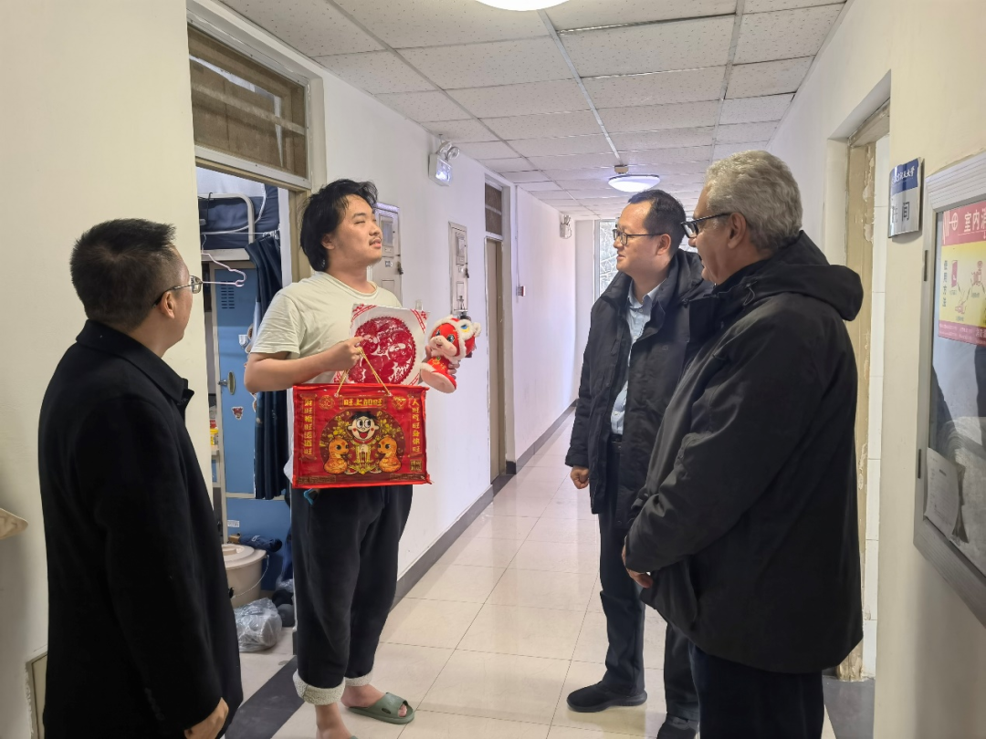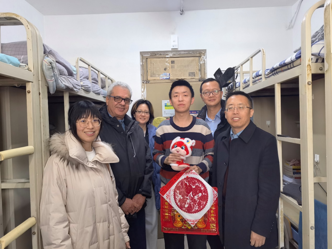 祥龙贺瑞辞旧岁,灵蛇纳福启新程。2025年1月23日,中国农历新年到来之际,william威廉中文官网/国际通用工程公司党委书记张江、经理耿立升、法方经理布卡麦(Adnane Boukamel)、副经理黄行蓉、分团委书记张莉和员工辅导员一同前往实验室和员工宿舍,看望在校员工和法籍教师,并送去了新春祝福。