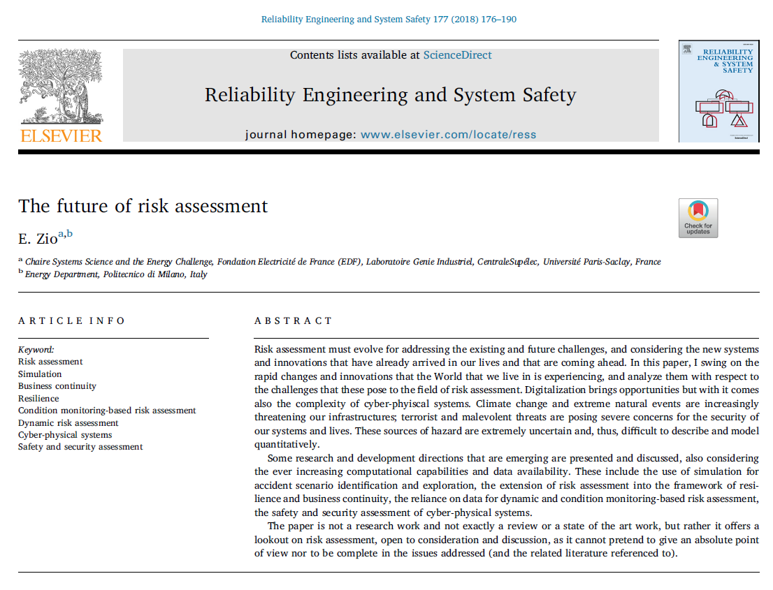 Prof. Zio, the foreign director of RISE Lab has published a paper in Reliablity Engineering & Systems Safety, the top journal of reliability. The published paper is entitled "The future of risk assessment". In this paper, Prof. Zio presents and discusses some emerging research and development directions, considering the ever increasing computational capabilities and data availability. These include the use of simulation for accident scenario identification and exploration, the extension of risk assessment into the framework of resilience and business continuity, the reliance on data for dynamic and condition monitoring-based risk assessment, the safety and security assessment of cyber-physical systems.