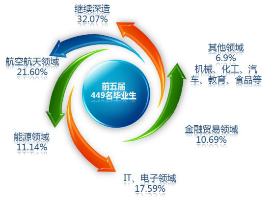 对毕业生的就业领域进行分析,前五届员工中,64.81%的员工选择了在国内工作,29.84%的员工选择了出国深造,而出国工作和在国内深造的各有近3.12%和2.23%。